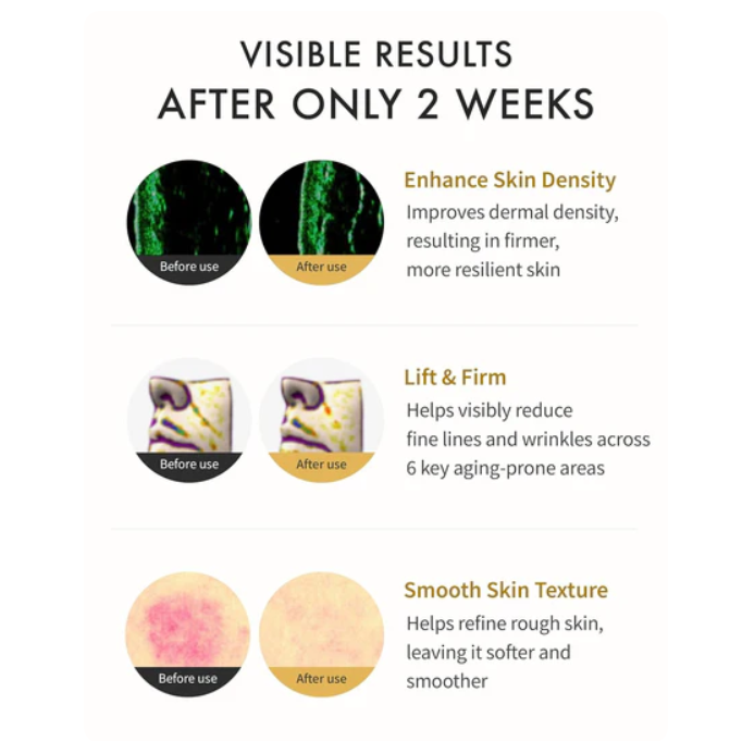 Wrinkle Depth Reduction: Eye wrinkles reduced by 16.86% after 7 days and 19.07% after 2 weeks. Mouth wrinkles reduced by 21.20% after 7 days and 22.41% after 2 weeks. Neck wrinkles reduced by 18.56% after 7 days and 25.61% after 2 weeks. Hand wrinkles reduced by 9.36% after 7 days and 12.66% after 2 weeks.